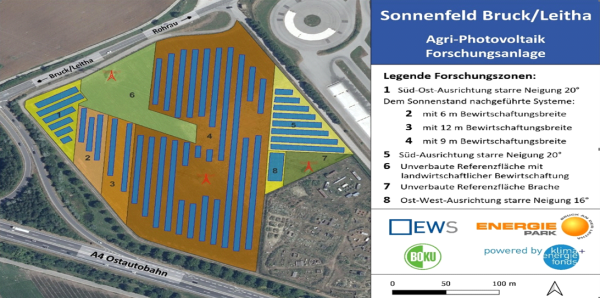 Die Forschungsfläche ist in acht Zonen unterteilt. Ziel ist es, mit dieser Anlage die perfekten Produktionsbedingungen und -methoden (Strom + Landwirtschaft) – angepasst an die standortspezifischen a-/biotischen Faktoren – ausfindig zu machen, weshalb nachfolgende acht Forschungszonen (FZ) unter Begleitung der Universität für Bodenkultur eingehend untersucht werden: